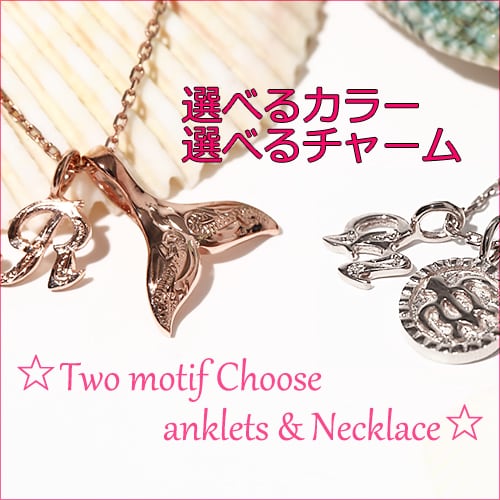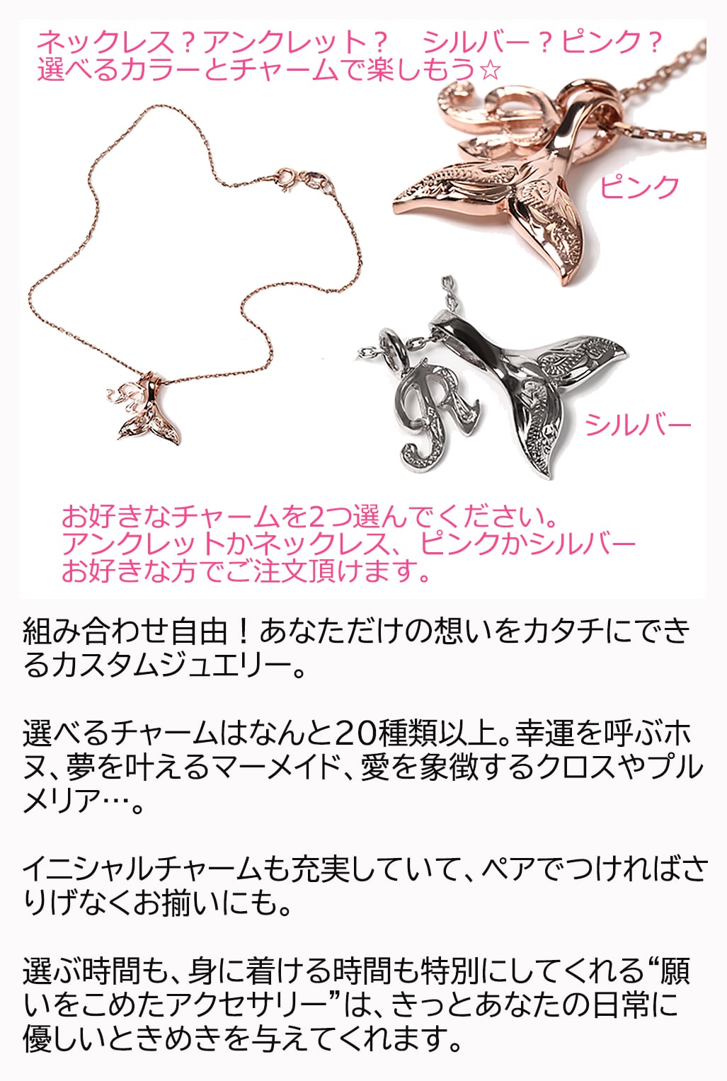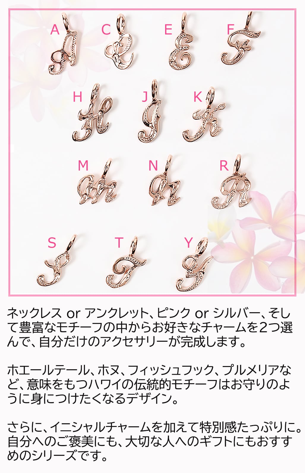 楽園ハワイからインスピレーションを得てデザインされた、キュートなミニチャームが2つついたアンクレットです。ハワイアンジュエリーの代表的なホエールテールやプルメリアなどお好きなモチーフをお選びいただいてお手軽にお楽しみください。チャーム自体はとっても小さいですが細かく丁寧に作られています。
