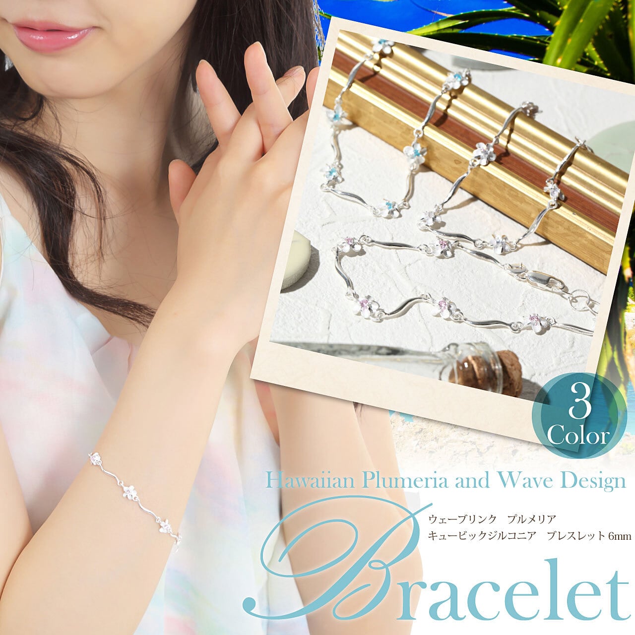 ハワイの象徴でもあるかわいいプルメリアにキュービックジルコニアがあしらわれた上品でお洒落な「ハワイアンウェーブリンクプルメリアブレスレット」のご紹介です。プルメリアとプルメリアの間のウェーブされたシルバーは高級感をさらにUPさせた手の込んだ作りになっています。お揃いでアンクレットもございます!手首と足首両方おそろいにつけても可愛いですね!プレゼントにもお勧めです。「種類を選択してください」をタップしてお好きなカラーをお選びください。