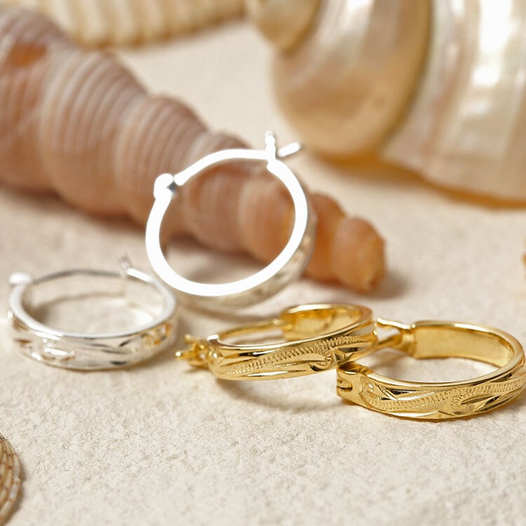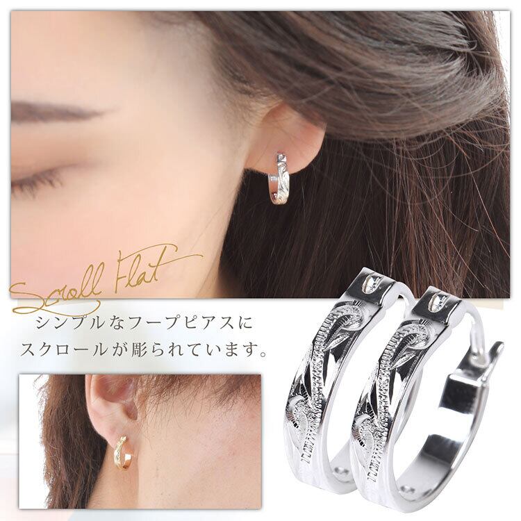 人気のフープピアスにハワイアンジュエリーならではのスクロール(波)が彫られtおしゃれなピアス。男性女性問わずおつけいただけます。「種類を選択してください」をタップしてお好きなカラーをお選びください。