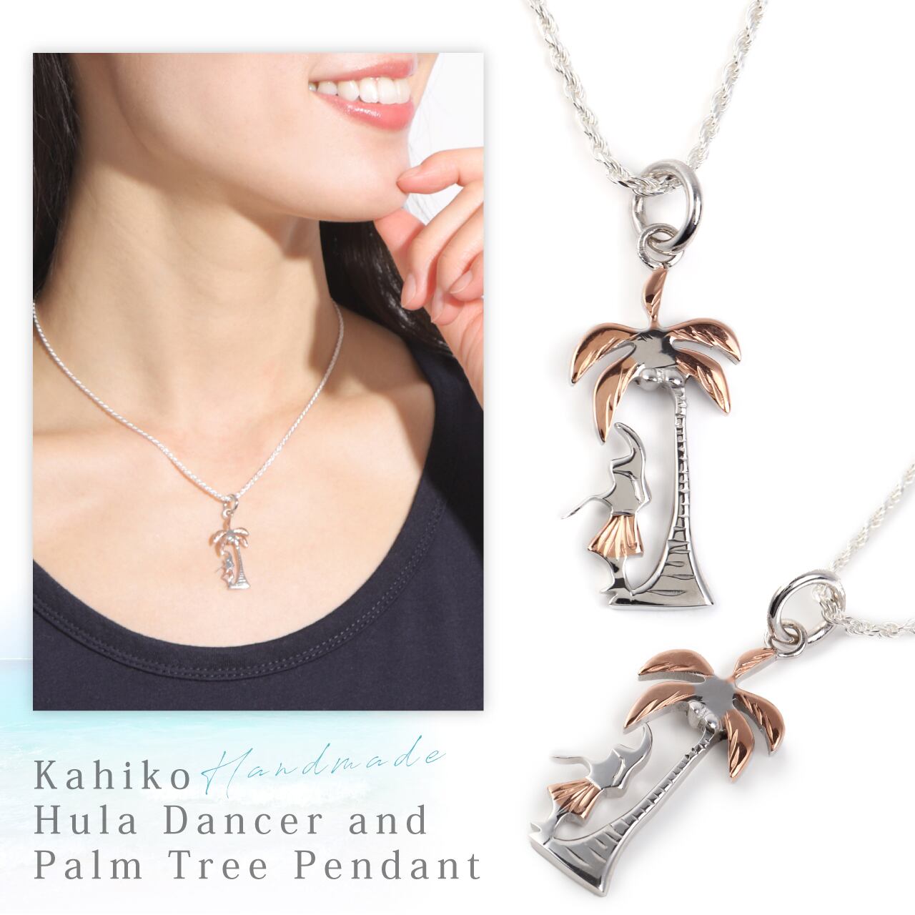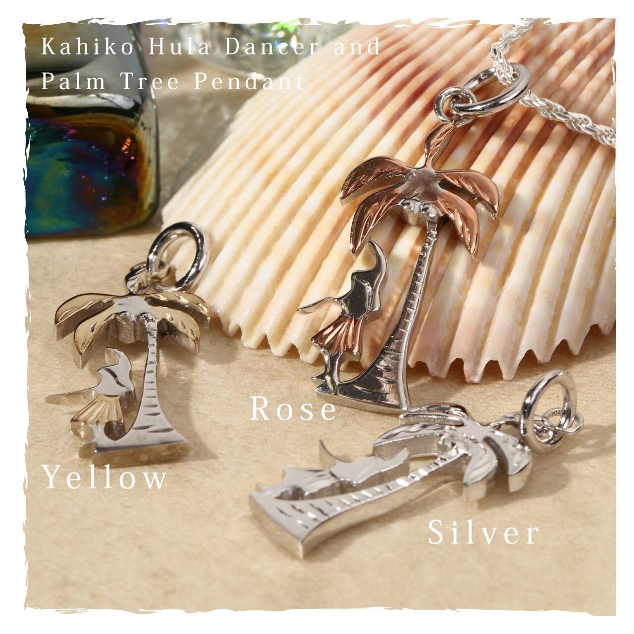 優雅に踊るハワイのフラダンサーをモチーフにしたカヒコシリーズのペンダント。南国ならではのパームツリーの下で優雅に踊るフラダンサーがとてもかわいいネックレスです。カラーはシルバー、ローズ、イエローの3色です。こちらハワイアンジュエリーと相性の良いシルバー925ロープチェーン付です。40,45,50cmからお選びください。「種類を選択してください」をタップするとお選びいただけます。モデルのチェーンは40cmになります。