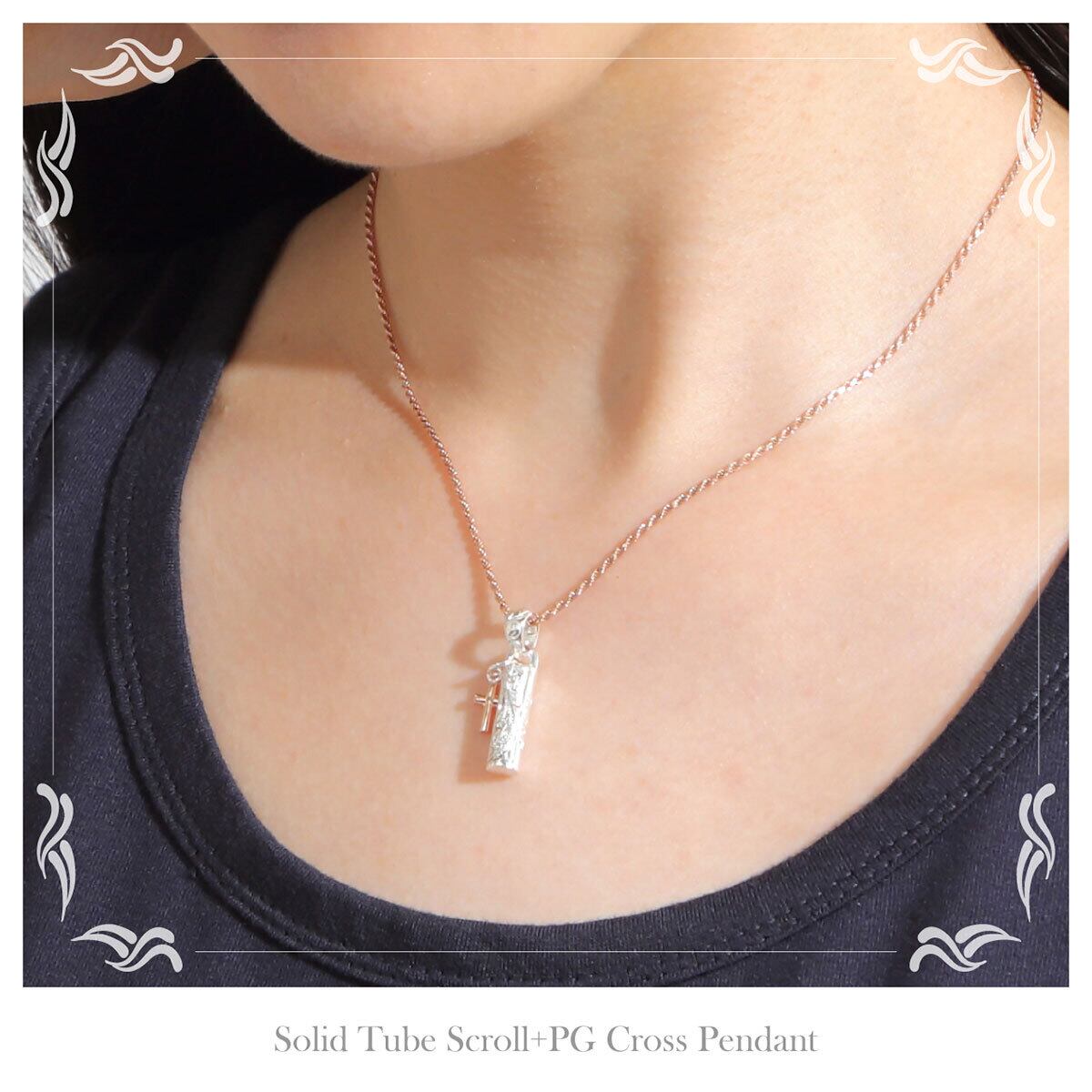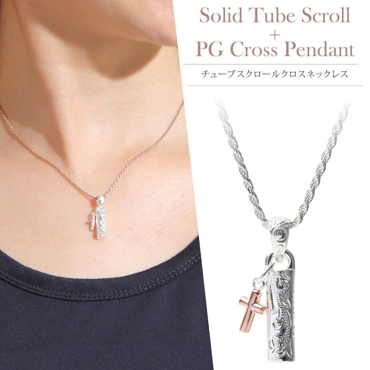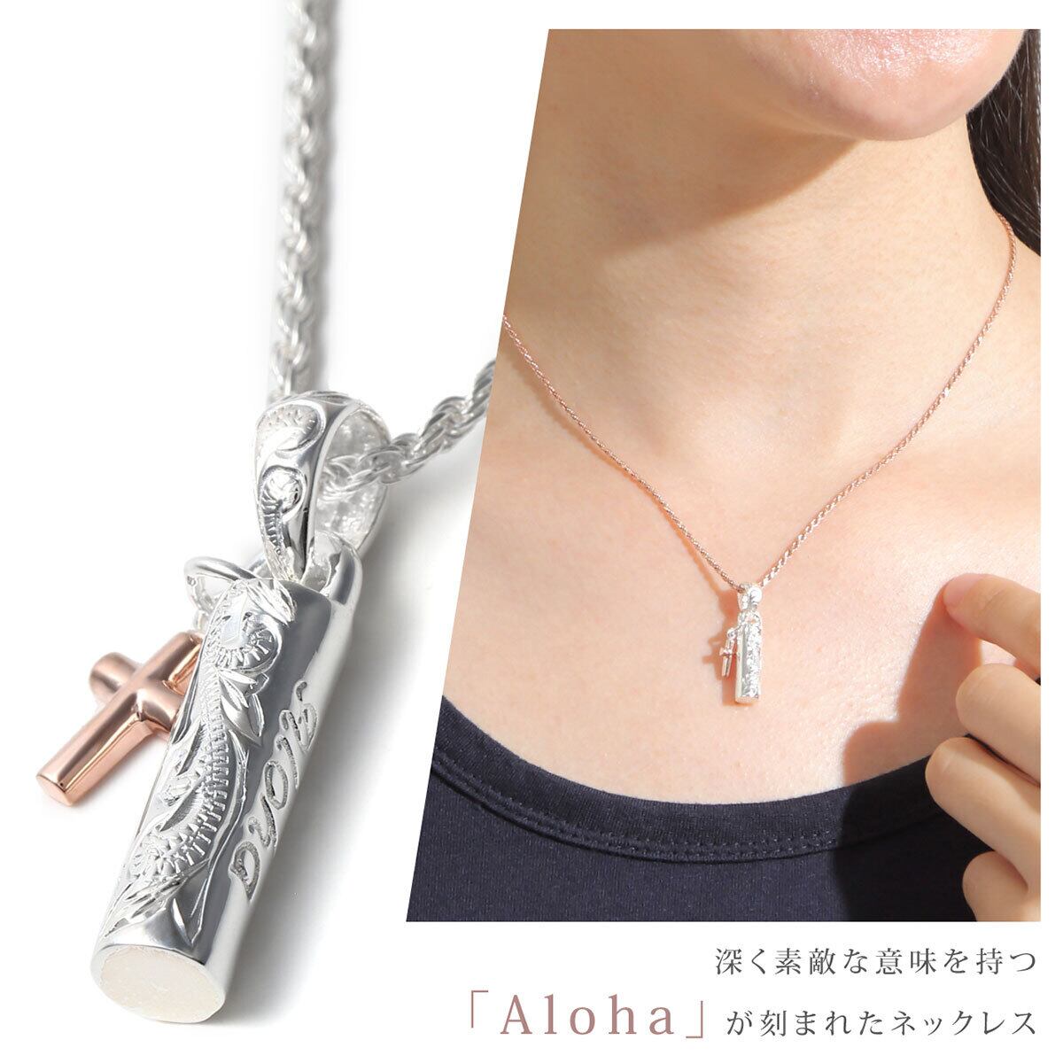 愛のこもったAlohaが刻まれた可愛いチューブペンダントです。永遠を表すスクロール(波)が刻まれ、誓いを意味するピンゴールドの十字架(クロス)が付いています。こちらハワイアンジュエリーと相性の良いシルバー925ロープチェーン付です。40,45,50cmからお選びください。「種類を選択してください」をタップするとお選びいただけます。