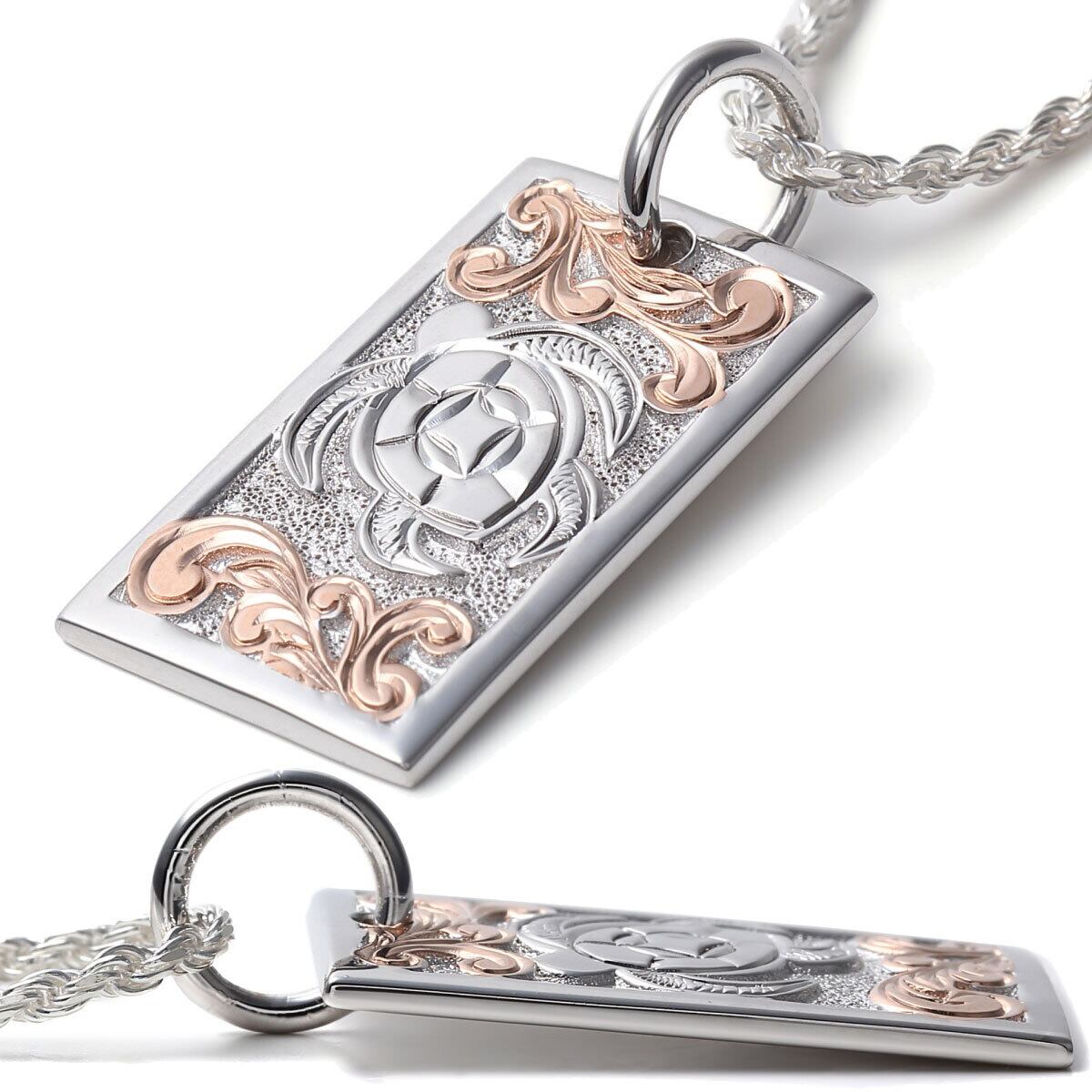 ホヌがピンクのハワイアンウェーブを楽しんでいるようなハワイアンネックレス。ピンクゴールドとロジウム加工の組み合せが綺麗なデザインです。少しレトロなオールドハワイアンな雰囲気が人気のネックレスです。こちらハワイアンジュエリーと相性の良いシルバー925ロープチェーン付です。40,45,50cmからお選びください。「種類を選択してください」をタップするとお選びいただけます。画像の男性は45cmチェーン、女性は40cmチェーンの1.2mmになります。