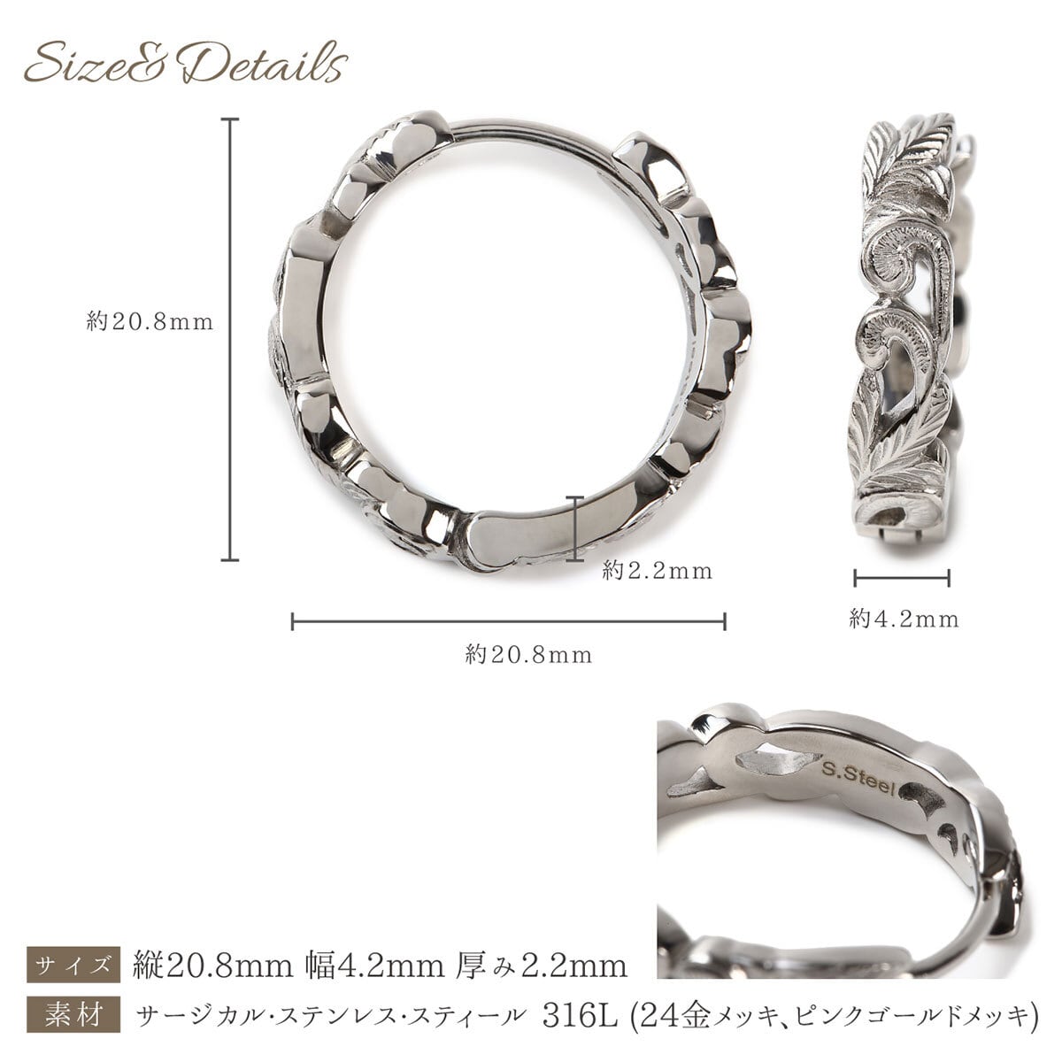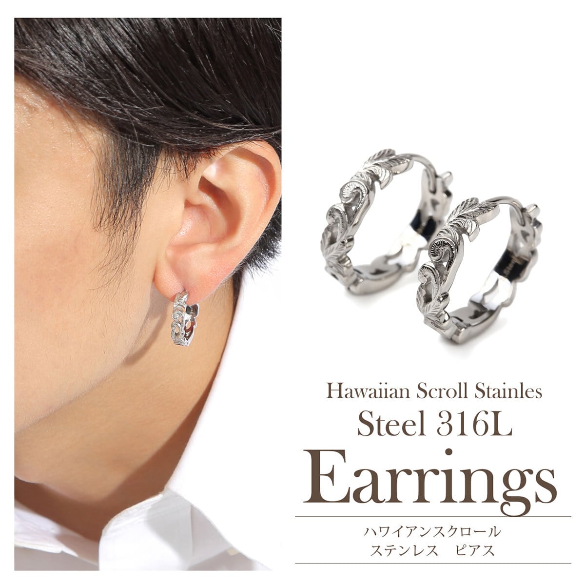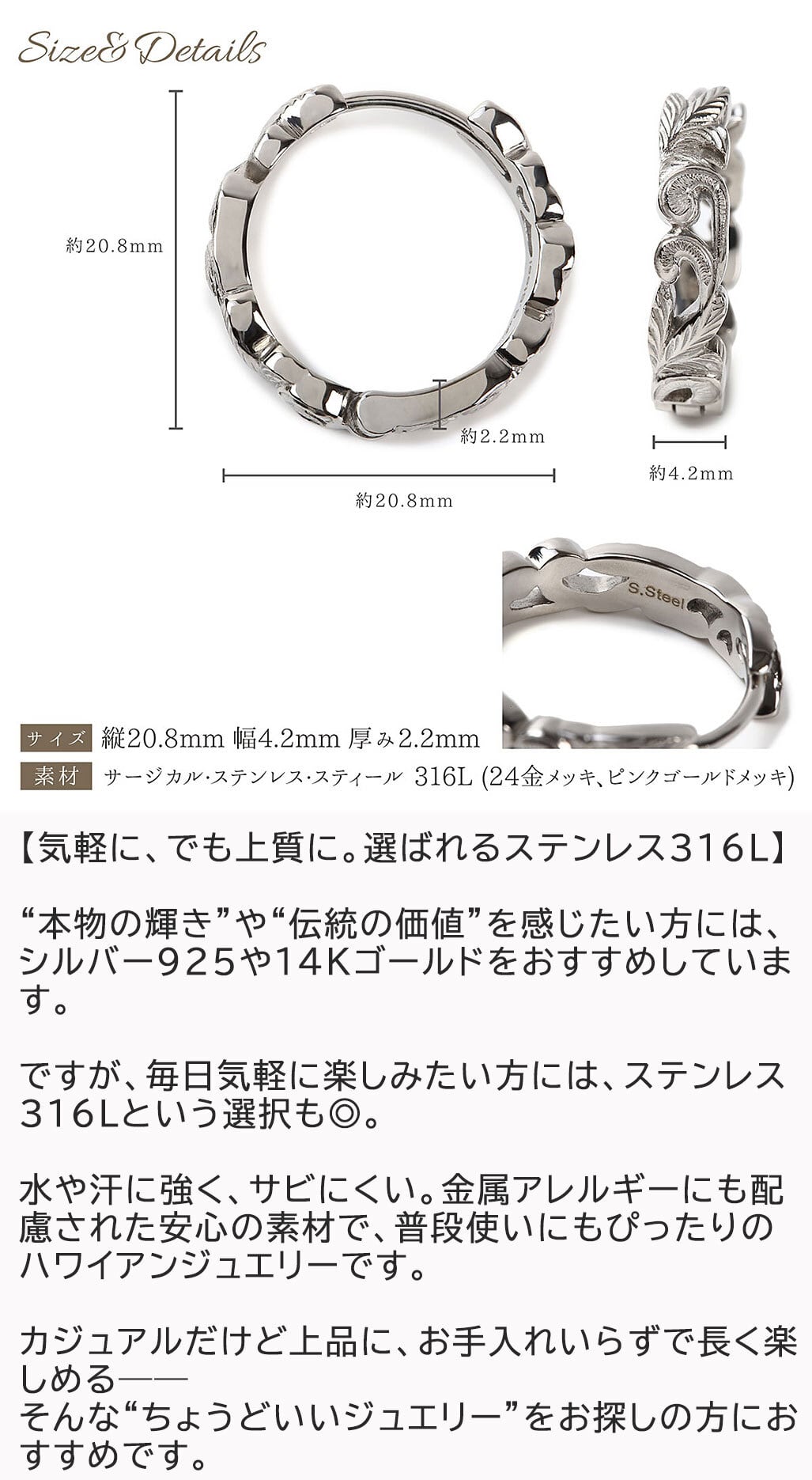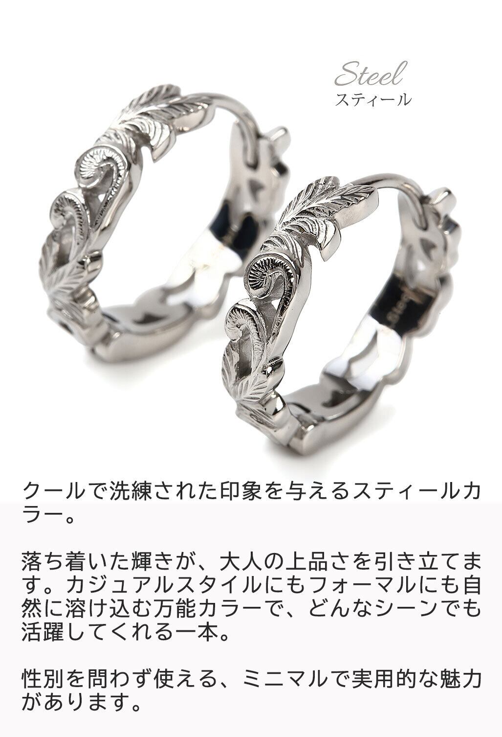 アレルギーでお悩みの方にもおすすめのお肌に優しいステンレス製でハワイならではのスクロール(波)が丁寧に彫られた透かし彫りのピアスになります。男性女性問わずお使いいただけますのでペアでもおすすめです。こちらの商品は両耳でワンセットの販売となります。「オプションを選択してください」をタップしてお好きなカラーをお選びください。