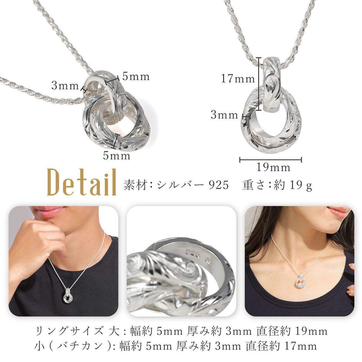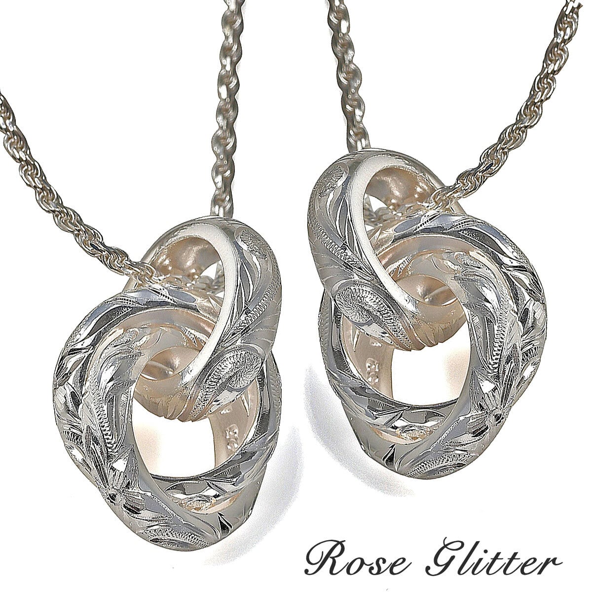 ペアにも最適な高級感あふれるワンランク上のハワイアンジュエリー、トリプルリングペンダントになります。3つのリングにはプルメリアとスクロール(波)がしっかり彫られています。永遠の意味を持つスクロールと幸せの意味を持つプルメリアのペンダントを末永くお使いください。ハワイアンジュエリーと相性の良いシルバーロープチェーン付です。