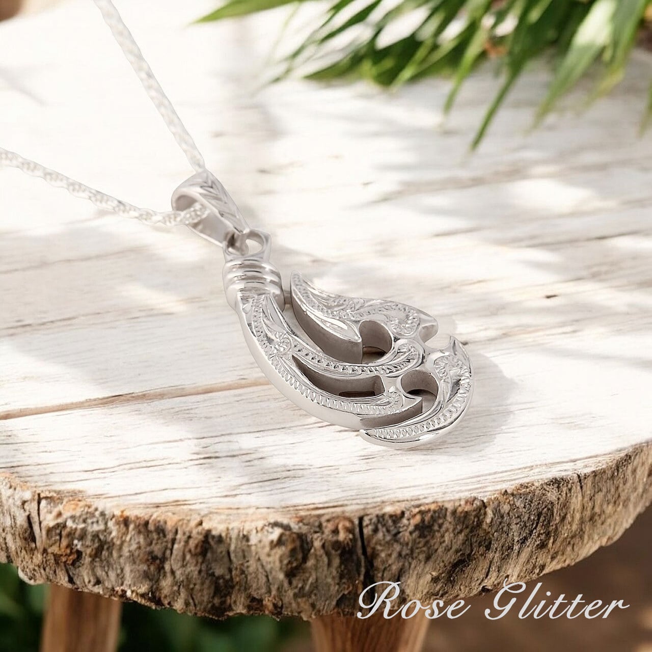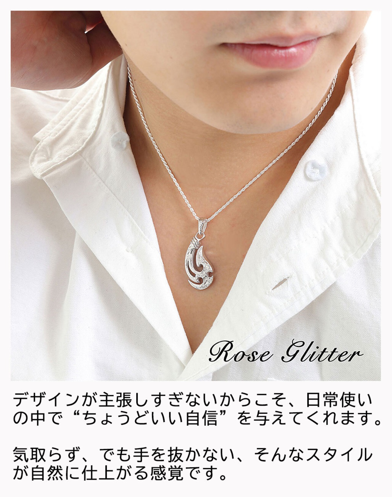 幸せを吊り上げるといわれるフィッシュフックネックレスはハワイアンジュエリーならではの昔から人気のモチーフです。両面ともしっかりと手彫りされ、厚みもある高級感たっぷりの男性にお勧めのネックレス。古代のハワイでは特別なパワー(マナ)が宿る釣り針は、「幸運を呼び寄せる」お守りとして身につけられていました。一度釣り針にかかると魚は絶対抜けないことから幸運を逃がさない、恋人と決して離れないという意味もあるようでペアでも人気のネックレスです。こちらハワイアンジュエリーと相性の良いシルバー925ロープチェーン付です。40,45,50cmからお選びください。「種類を選択してください」をタップするとお選びいただけます。