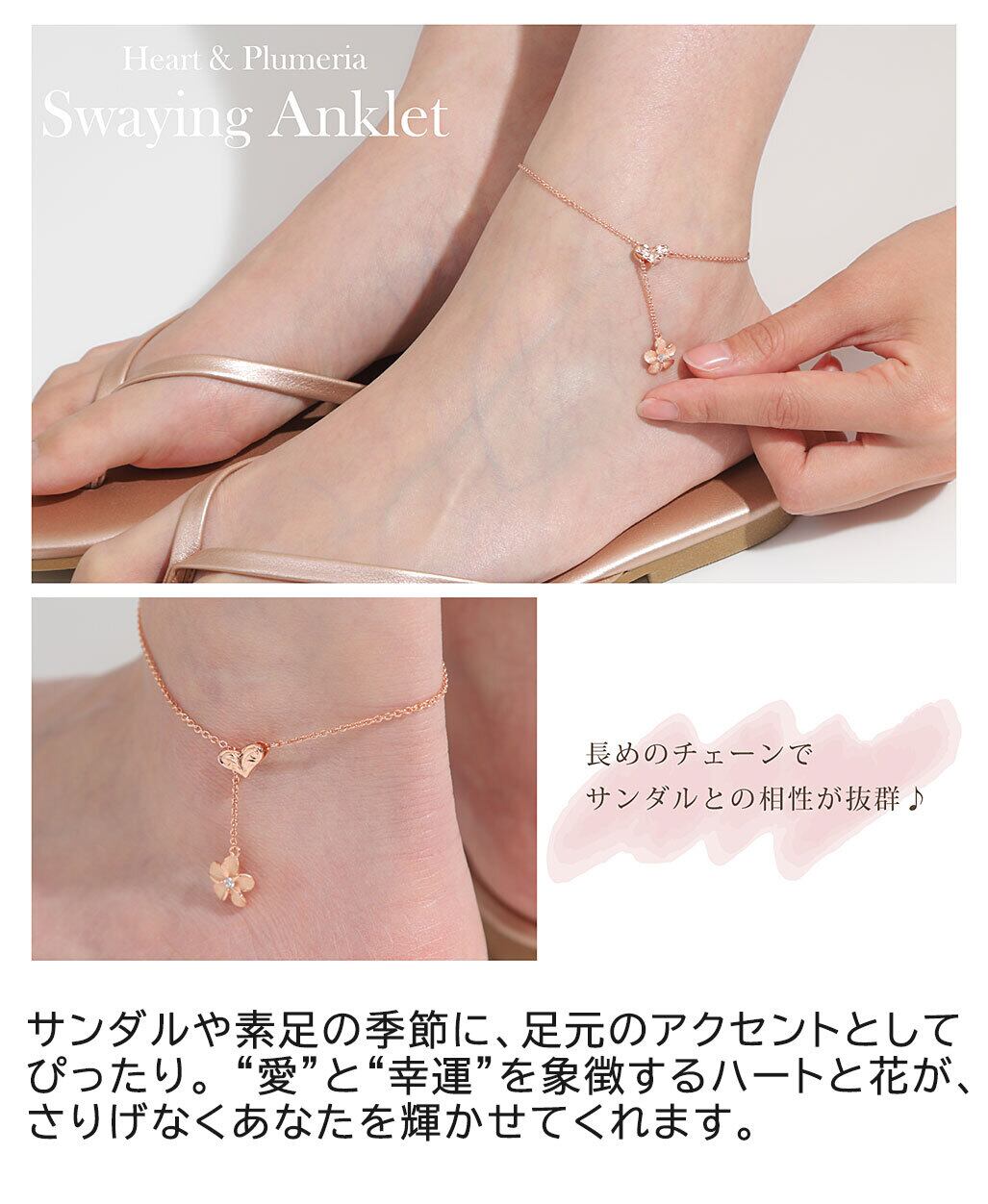 可愛らしいハートとプルメリアモチーフのアンクレット。ハートの部分でチェーンを挟んで自分の足首に合わせて調整することができます。ゆらゆらと揺れるプルメリアが足元を華やかに演出。サンダルの季節におすすめのアンクレットです。ぜひ、自分へのご褒美や大切な人へのギフトにお選びください。同じタイプのネックレも販売しております。ぜひご覧ください!