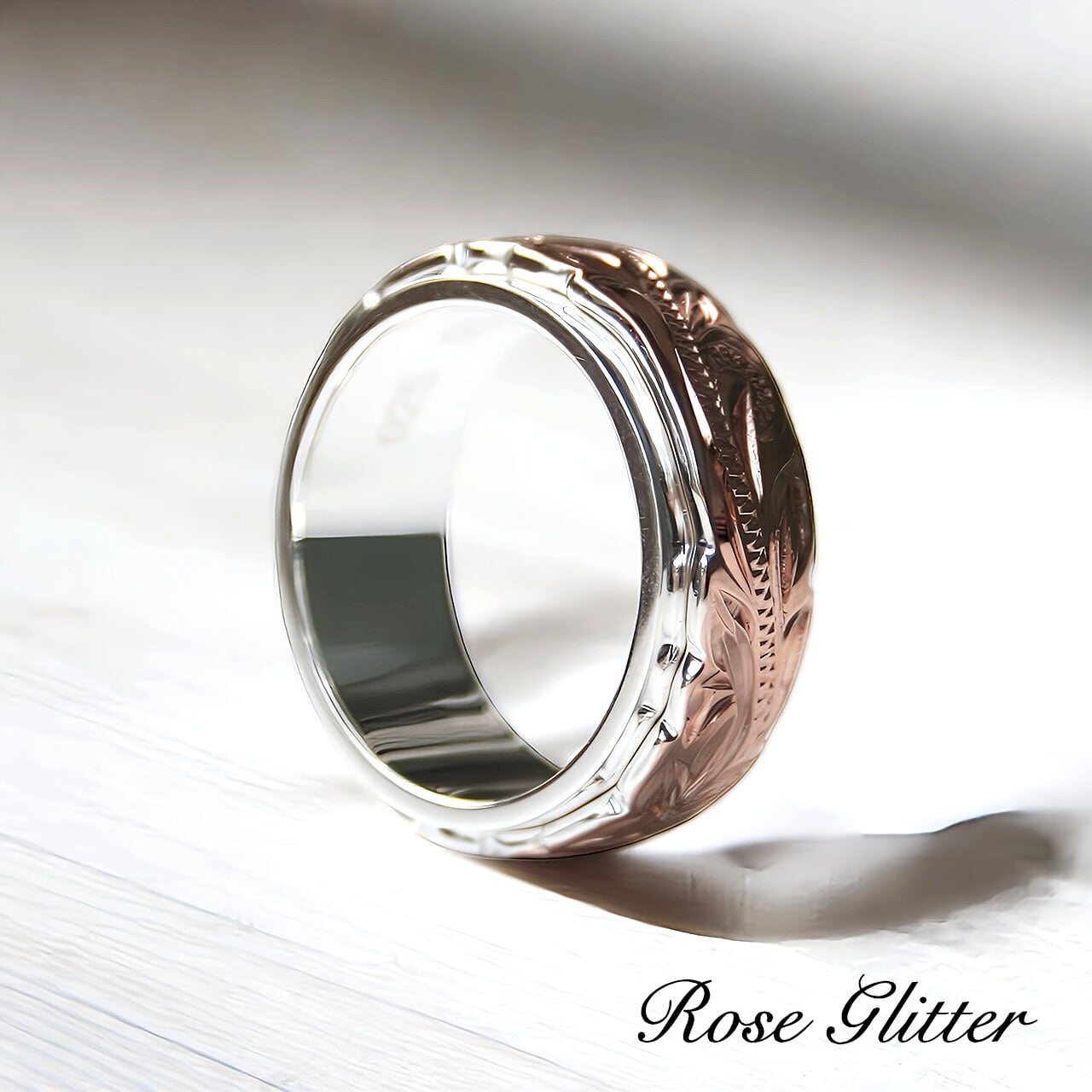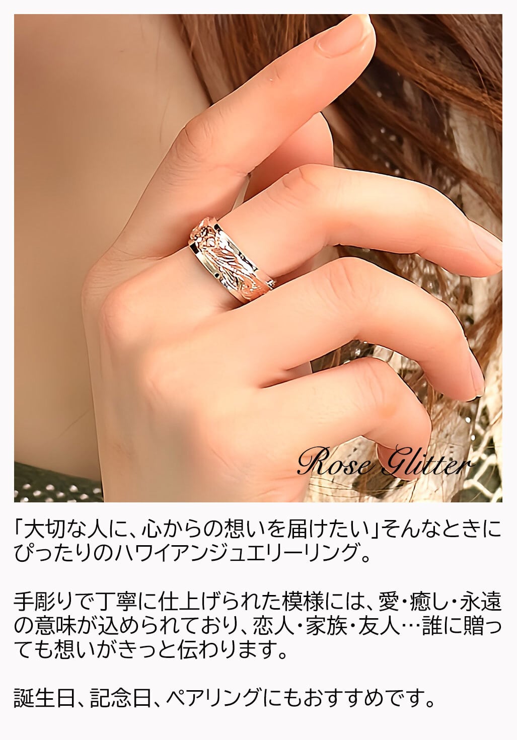 Rose Glitterで人気のリングのご紹介です。甘く華やかな14Kピンクゴールドとシルバーの2トーンリングは女性らしい優雅なデザインで、指元をさりげなく彩ります。スクロールとプルメリアのモチーフがハワイのイメージにぴったりとマッチ。ゴールドとシルバーのコントラストが美しく、ゴージャスで高級感のある印象も与えます。