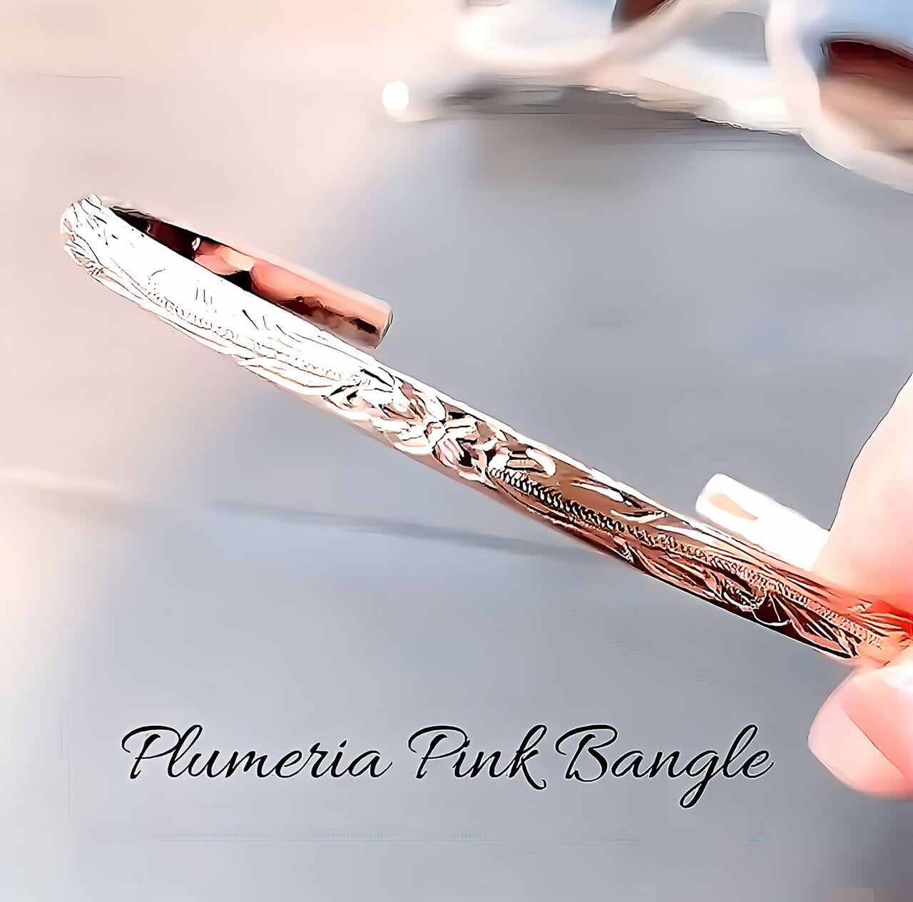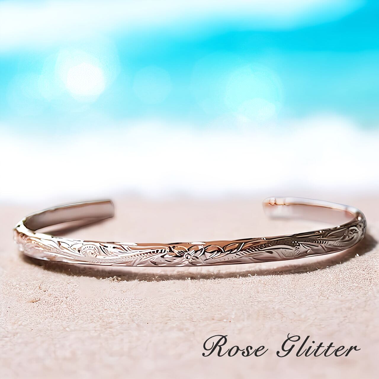 ハワイアンジュエリーの代表的なデザイン、プルメリアをモチーフにしたスクロールカフバングル。女性に人気のピンクゴールドカラーが可愛いバングルになります。細身の4mm幅ですが2mmの厚みがありますので高級感と存在感がたっぷり。サイドにもしっかりとスクロールが彫られた手彫りならではの美しいバングルです。普段使いはもちろん、特別な日のアクセントにもぴったりです。素敵な出会いをお楽しみください。