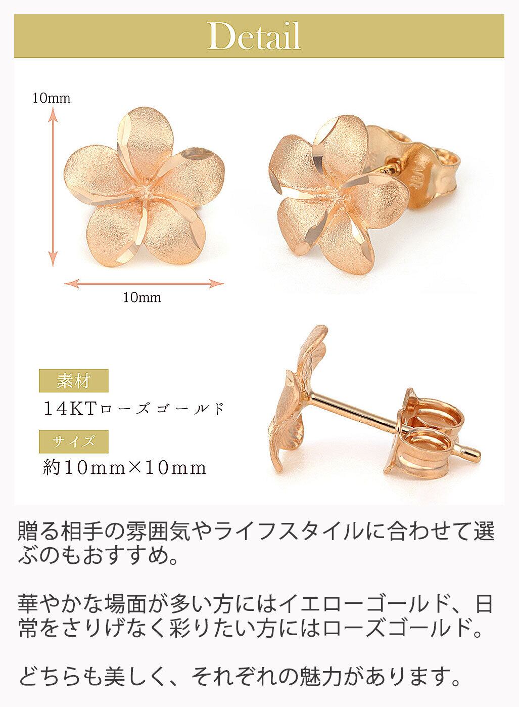 上品なローズゴールドカラーが大人の女性にふさわしいピアスになります。ハワイアンジュエリーならではのプルメリアのデザインが女性らしさを引き立て、高級感漂う一品。